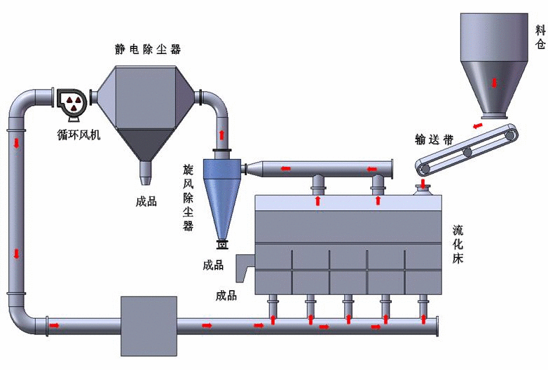 散粒状的固体物料,由螺旋加料器加人流化床干燥器中。空气由鼓风机送人燃烧室,加热后送入流化床底部经分布板与固体物料接触,形成流态化,达到气固相的热质交换,物料干燥后由排料口排出。尾气由流化床顶部排出,经旋风分离器组回收。被带出的产品,再经洗涤器和雾沫分离器后排空。