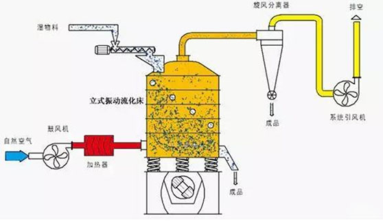 由安装于主机下部的两个振动电机同步反向回转,使安装于其上的多层环状孔板组成的主机产生垂直振动与扭振,从而使由进料口进入的物料沿水平环状孔板自上层向下层连续跳跃运动。热空气则自下层向上层通过各层孔板穿过物料层,达到物料均匀干燥目的。