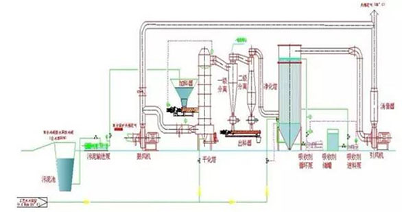湿物料薄膜在热载体的内部作用下和热空气外部作用下迅速完成干燥过程,然后在载体相互之间碰撞下变干的湿物料薄膜脱落并被粉碎。达到一定粒度后,随干燥尾气带出干燥器,由系统后部的除尘设备收集。