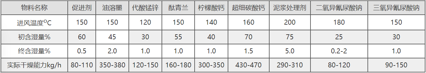 注:1.水分蒸发量是以进风温度为1 80oC,出风温度为80oC 时每小时蒸发的水份,