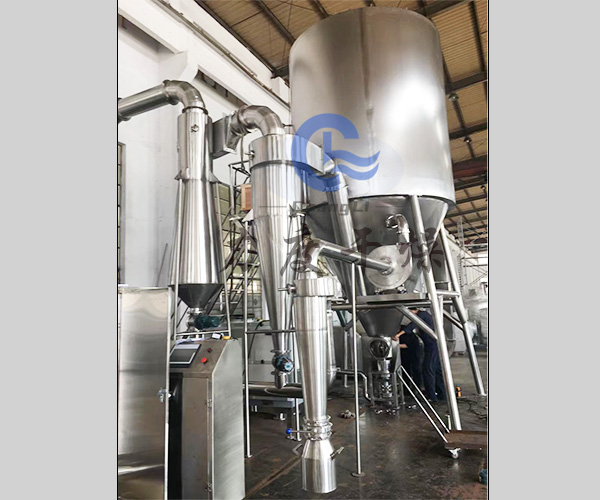 空气通过过滤器和加热器,进入离心喷雾干燥器顶部的空气分配器,热空气呈螺旋状均匀进入干燥器。料液由料液槽经过滤器由泵送至干燥器顶部的离心雾化器,使料液喷成极小的雾状液滴,料液和热空气并流接触,水分迅速蒸发,在极短时间内干燥成成品,成品由干燥塔底部和旋风分离器排出,废气由风机排出。